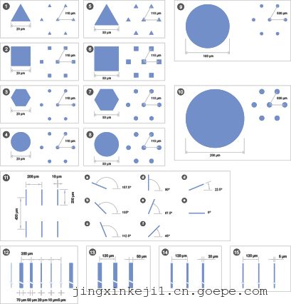 測試圖案幾何形狀包括大量的各種形狀和尺寸的被放置在腔式蓋片的µ-Slide 8 Well high和通道載玻片VI 0.4。它們有不同的尺寸,包括三角形,正方形,六邊形,圓形和直線形。